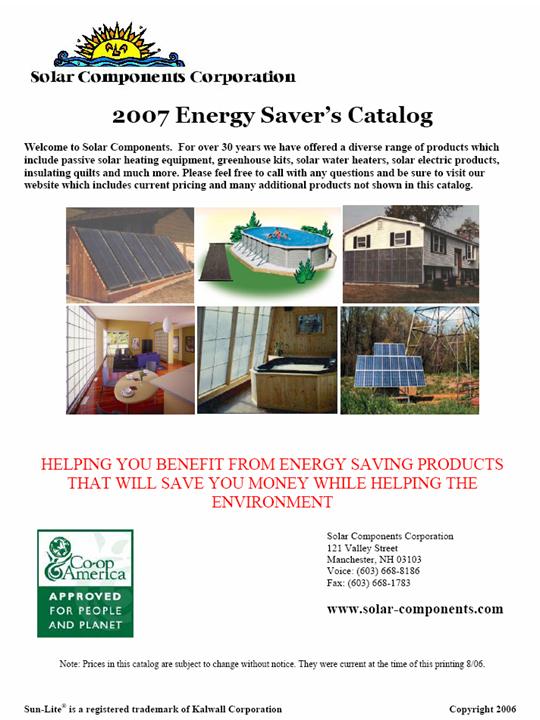 To Download the 2007 Solar Components Energy Savers Catalog "right-click" over the photo and choose "Save Target as" (for Windows) or Control Key-Click (for Macs) and choose "Download link to disk". You will need Adobe Acrobat Reader to open the file.